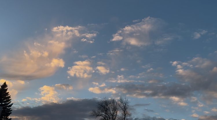 Here is a picture of the beautiful blue sky with some clouds and couple trees in Kulm this evening during sunset.