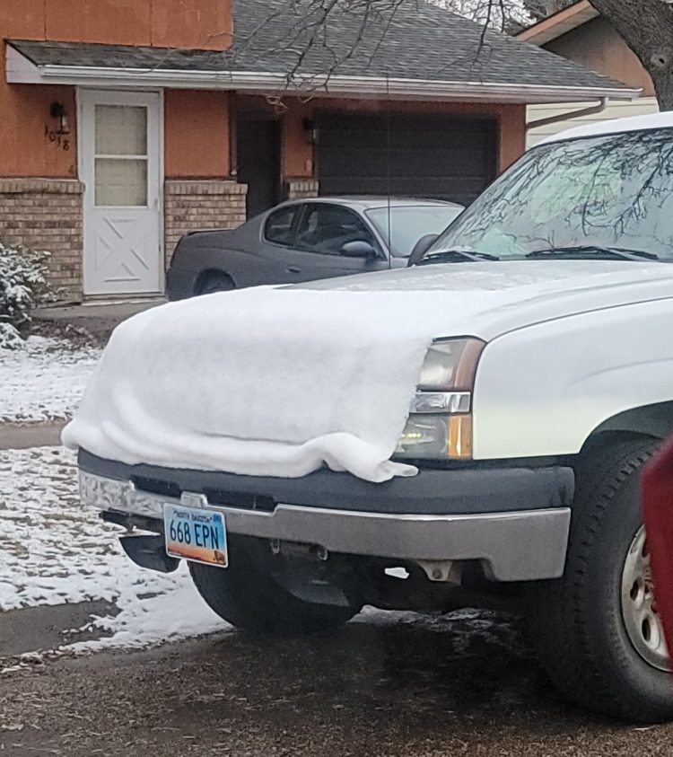 A 'blanket' of snow warms the neighbor's truck.