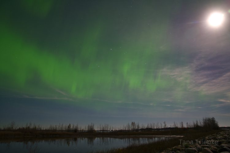 Northern lights meet the Beaver Super Moon with reflections over Devils Lake.