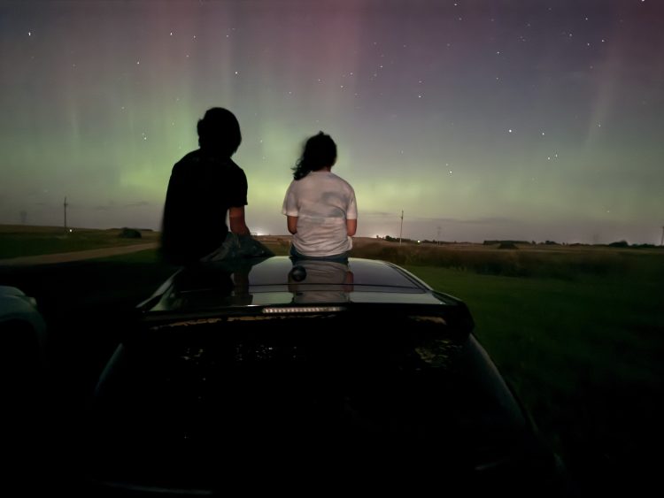 Silhouettes of a brother and sister sitting on top of a car looking at the northern lights