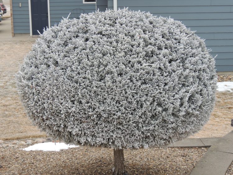 This topiary is covered with frost on a cool morning.