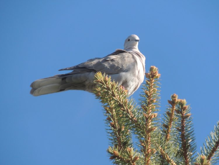 This dove is sitting on top of the world enjoying the clear blue sky and bright sunshine.