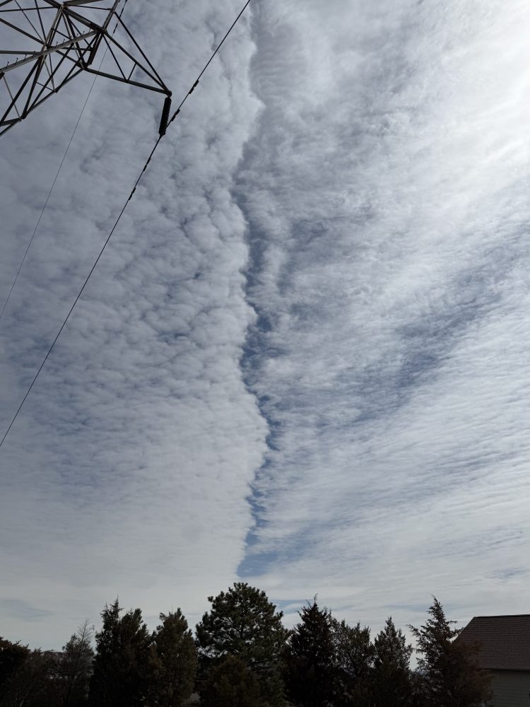 I forgot to send this when I took the picture this afternoon. I thought it was interesting. How there was a line between the two different cloud patterns.