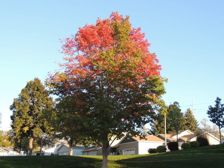 This tree has several different colors of leaves as they turn color for autumn.