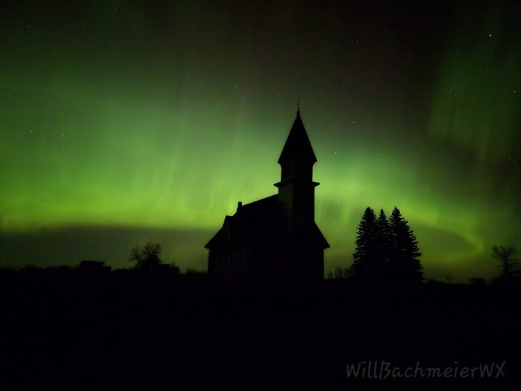 Aurora captured over Norway Lutheran Church in rural McHenry County