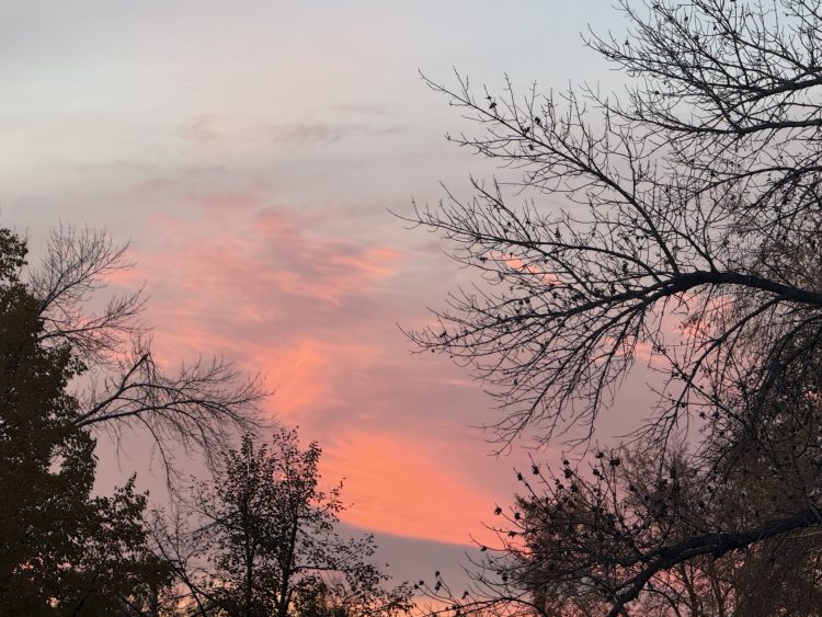A picture of the pink clouds during sunset with some trees at Kulm, ND