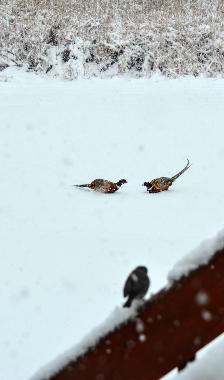 Two roosters squaring off to sharpen their cock fighting skills. A Junco from the deck railing watches them play in the newly falling snow.