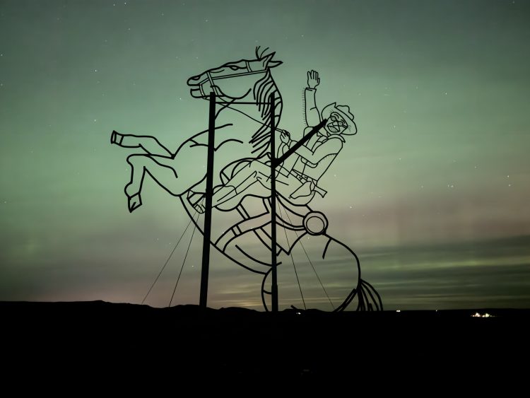 Enchanted Hwy Teddy Roosevelt Sculpture, to use as a silhouette against the beautiful Northern Lights dancing in the sky.